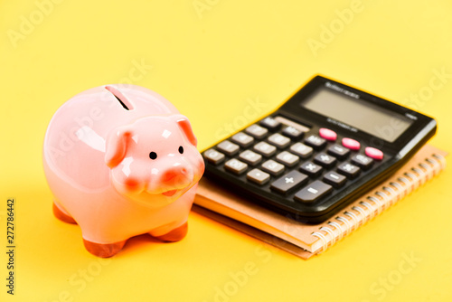 Money budget planning. Calculate profit. Piggy bank pink pig and calculator. Financial wellbeing. Economics and finance. Credit concept. Money saving. Save money. Banking account. Earn money salary