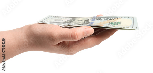 Money exchange. Woman holding dollar banknotes on white background, closeup