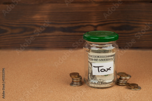 Money in the bank on wooden background. Collage of piggy bank, stacks of coins. Concept of Accruals for taxation, copy space