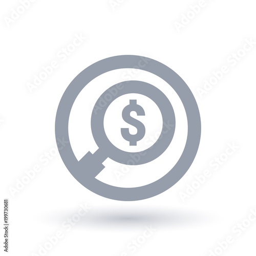 Money magnifying glass icon in circle outline. American dollar search symbol. Finance magnify sign. Vector illustration.
