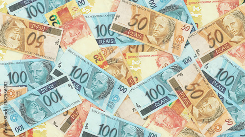 Money scattered. 100, 50 and 20 reais. Money from Brazil. 3d rendering.