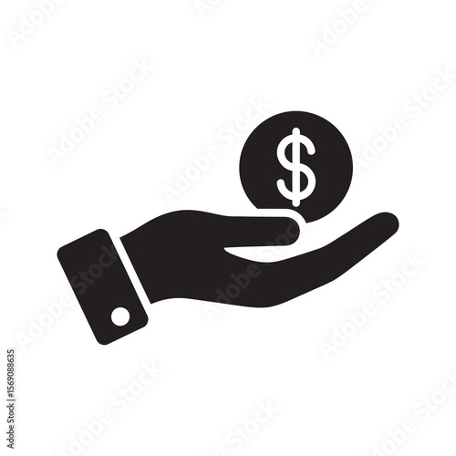 Money transaction icon with a hand giving a dollar coin representing payment donation charity salary and financial support or purchase vector solid glyph