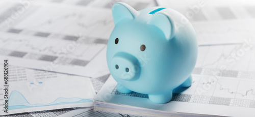 Moneybox for money on the background of documents and financial charts. Investment and capital accumulation concept