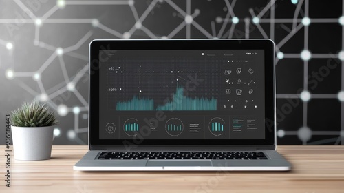 Monitoring Online Advertising Metrics on Laptop Screen in Professional Setup with Digital Background.