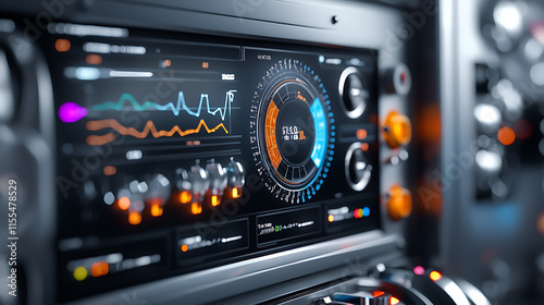 Monitoring systems in aviation cockpit high-tech instrumentation digital dashboard modern environment close-up view technology innovation