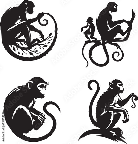Monkey black and white silhouette assets in vector form.