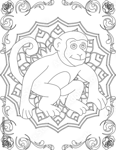 Monkey on Mandala Coloring Page. Printable Coloring Worksheet for Adults and Kids. Educational Resources for School and Preschool. Mandala Coloring for Adults