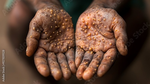 Monkey pox virus, a new world problem of modern humanity. Close-up of the hands of a sick person with pimples and blisters. Smallpox vaccine