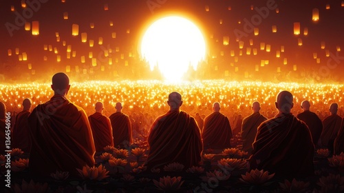 Monks releasing lanterns at sunset serene landscape cultural event tranquil atmosphere spiritual gathering