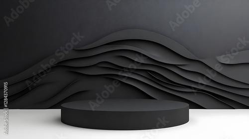 Monochromatic 3D Render: Abstract Black Wave Background with Cylindrical Display Platform AI Generated