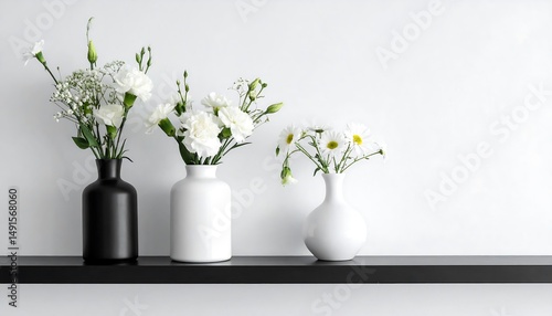 Monochromatic Floral Still Life: Elegant White and Black Vases with Daisies and Carnations