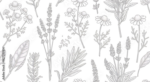 Monochromatic handdrawn botanical seamless pattern featuring chamomile flowers lavender sprigs and various herbal leaves with delicate shading.