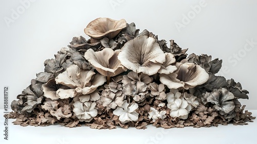 Monochromatic sepia toned mushroom cluster growing in layers, showing organic textures and natural patterns in earth tones, isolated on light background.