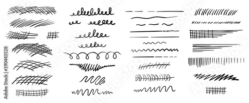 Monochrome brush stroke set, vector template isolated on white. Ink sketch brush black stencil. Hatching hand drawn texture set