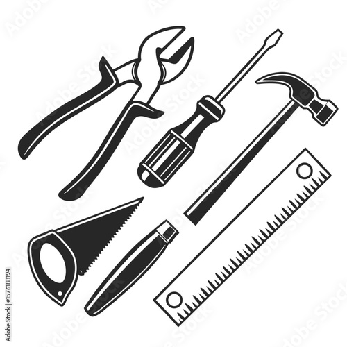 Monochrome Construction Tools Collection a Set of Essential Instruments for Building and Repair Work Depicted in Black and White Style