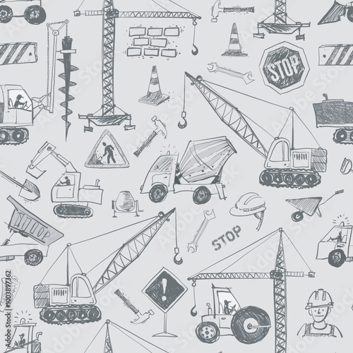 Monochrome construction-themed illustration featuring collection of hand-drawn sketches of various construction machinery such as cranes, excavators, and dump truck. Can be used for wallpaper, pattern