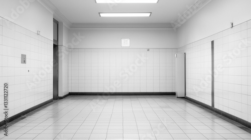 Monochrome Corridor: A stark, minimalistic hallway with tiled walls and a tiled floor, exuding a sense of symmetry and architectural precision, captured in grayscale.