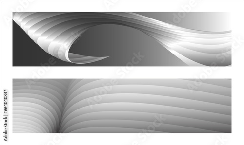 Monochrome cover design, abstract background. Wavy silver parallel gradient lines, ribbons, silk. Set of 2 backgrounds. Black and white with shades of gray banner, poster. eps vector