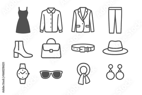Monochrome Fashion Icons. Outline icon set of monochrome outfit ideas: black dress, white blouse, blazer,