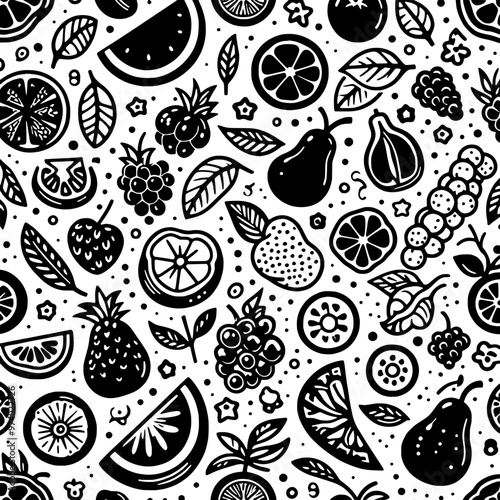 Monochrome Fruit and Leaf Vector Pattern - Seamless Decorative Design
