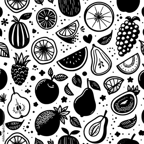 Monochrome Fruit and Leaf Vector Pattern - Seamless Decorative Design