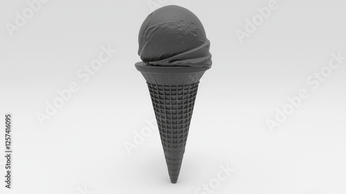 Monochrome ice cream cone with a scoop, standing on a plain white surface -ai