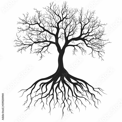 Monochrome Illustration of Bare Tree Silhouette with Intricate Roots and Branches: A Botanical Artwork Exploring Nature's Mystical Pattern and Lifecycles in Vintage Style