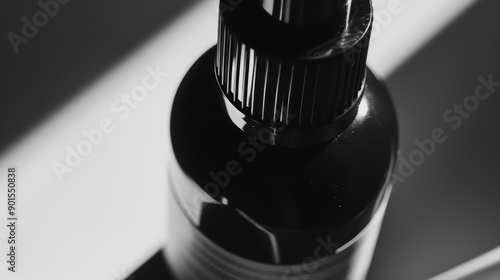 Monochrome image of black pump dispenser bottle casting shadow on white surface