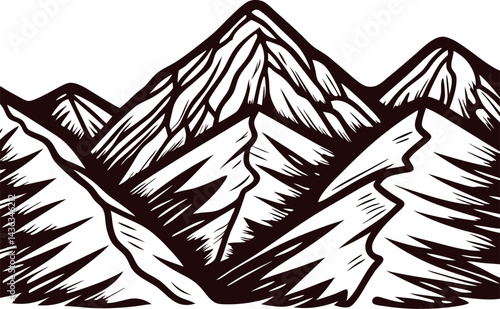 Monochrome mountain range sketch with snow capped peaks and rugged terrain