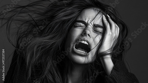 Monochrome photo of a young woman with closed eyes, screaming and pulling her hair