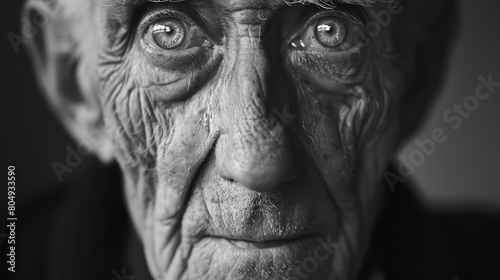 Monochrome portrait of an elderly man, focusing on the deep lines and wise eyes
