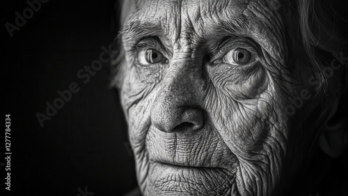 Monochrome portrait of an elderly person, highlighting deep wrinkles and facial contrast