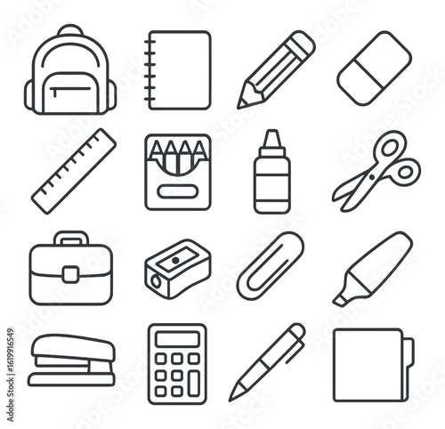 Monochrome school supplies grid: backpack, stationery, and calculator icons