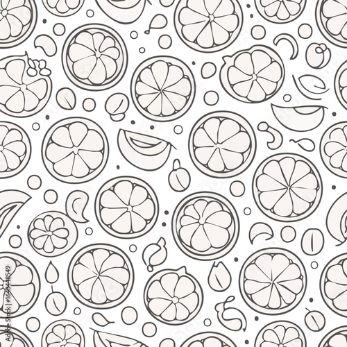 Monochrome seamless pattern featuring sliced oranges, leaves, and seeds, creating a repeating design.