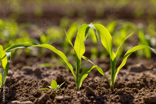 monocultural field with fresh corn sprouts in fertile soil with fertilizers, a field with ordinary soil that was fertilized, close up
