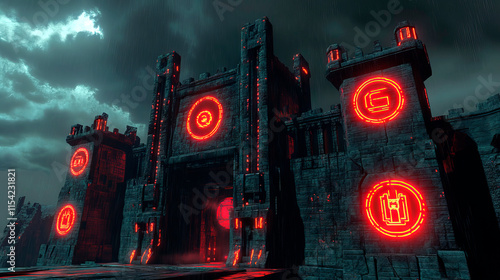 Monolithic Fortress with Laser Turrets Under Storm Clouds