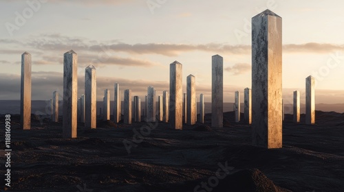 Monolithic Structures Standing Tall in an Arid Landscape at Sunset