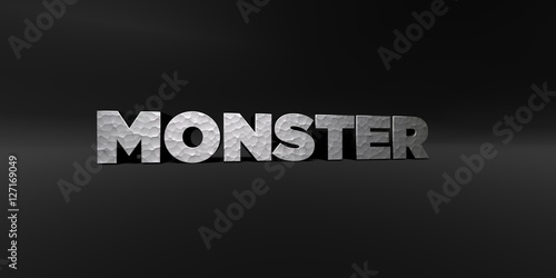 MONSTER - hammered metal finish text on black studio - 3D rendered royalty free stock photo. This image can be used for an online website banner ad or a print postcard.