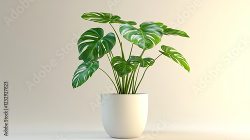 Monstera deliciosa plant in a white pot on a beige background