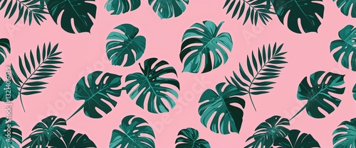 monstera leaf pattern on pink plain background digital abstract art work illustration design