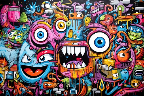 Monsters doodle drawing in pop art style. Cartoon set of funny comic creatures. Poster design. Ai generative