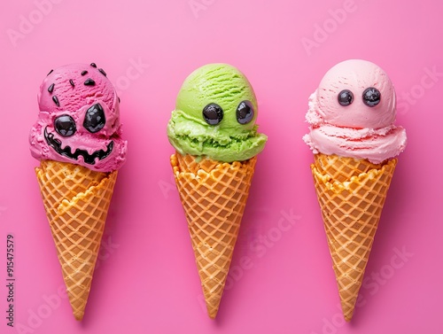 Monster-themed ice cream cones, Halloween backdrop, flat design illustration