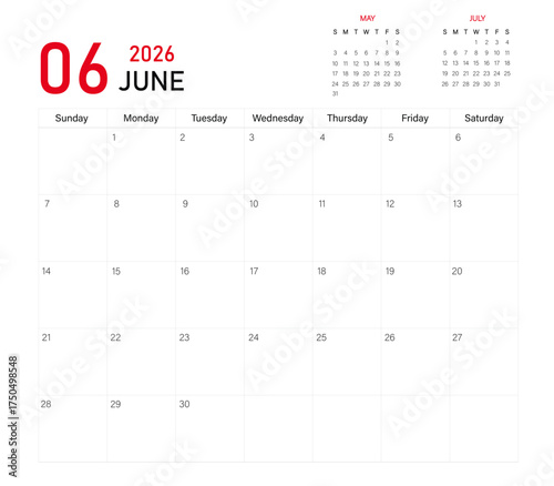 Month calendar | 6th month of 2026 on calendar with previous and next month | June month, 2026 started from Monday