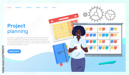 Month scheduling, to do plan, time management, checklist. Businesswoman stands near to do list and planning. Plan fulfilled, task completed, timetable sheet. Check list planning, schedule concept