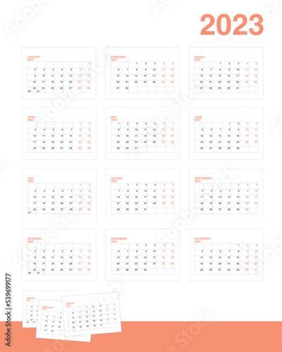 Monthly calendar grid 2023. A set of 12 pages of A5 calendar months horizontal. Vector illustration