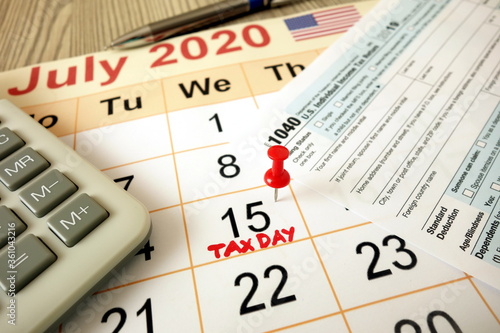 Monthly calendar showing date July 15th 2020 marked as tax day with 1040 form calculator and pen