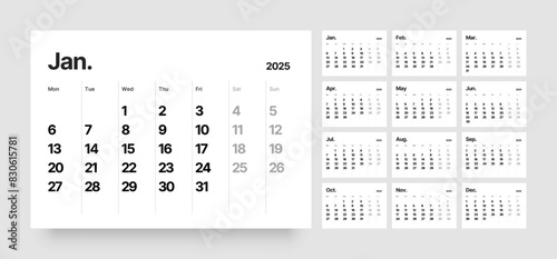 Monthly calendar template for 2025 year. Wall calendar in a minimalist style. Week Starts on Monday.