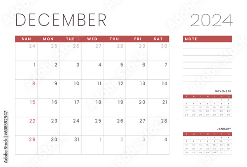 Monthly Calendar Template of december 2024. Vector layout of a wall or desk simple calendar with week start sunday