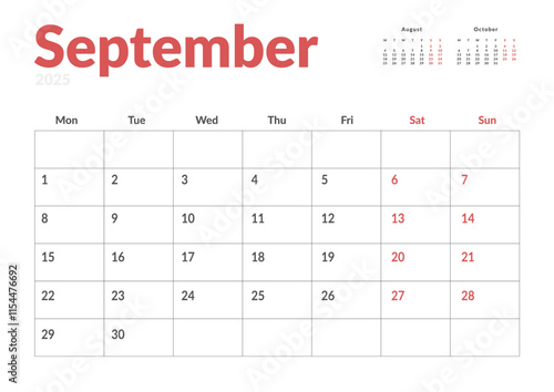 Monthly page Calendar Planner Template of September 2025. Vector layout of calendar with week start Monday for Scheduling. Page for size A4 or 21x29.7 cm