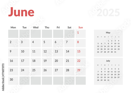 Monthly page Calendar Planner Templates of June 2025. Vector layout of simple calendar with week start Monday for print. Page for size A4 or 21x29.7 cm